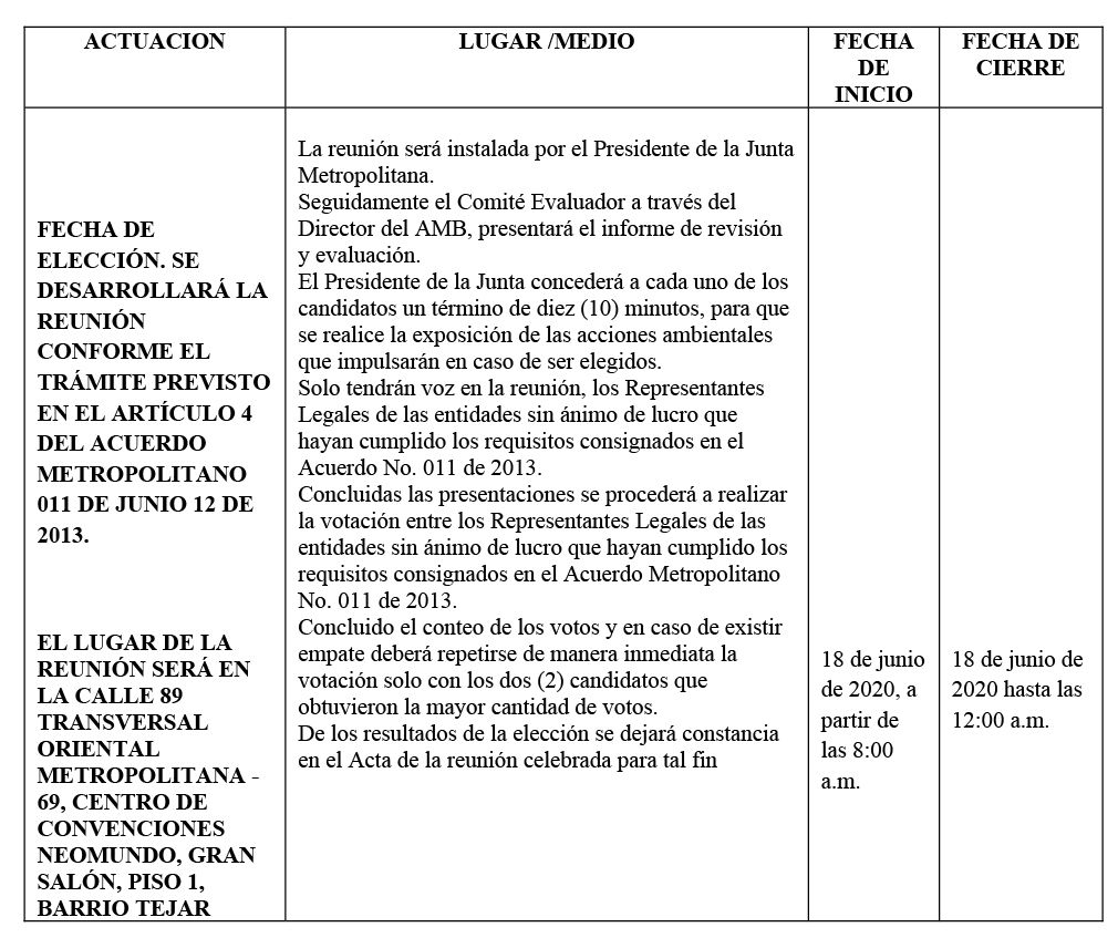 El artículo primero de la Resolución No. 000282 del 03 de abril de 2020, respecto al lugar previsto para la Elección del Representante de las ONG como miembro de la Junta Metropolitana del AMB, quedó de la siguiente manera: