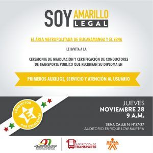 27 de noviembre | 119 conductores de transporte público recibirán sus diplomas en primeros auxilios, servicio y atención al usuario, este jueves 28 de noviembre, en virtud de una alianza entre el Área Metropolitana y el Servicio Nacional de Aprendizaje -SENA-, para brindar las oportunidades de profesionalización del gremio a través de procesos de capacitación en dicha Entidad de formación para el trabajo del Estado colombiano.