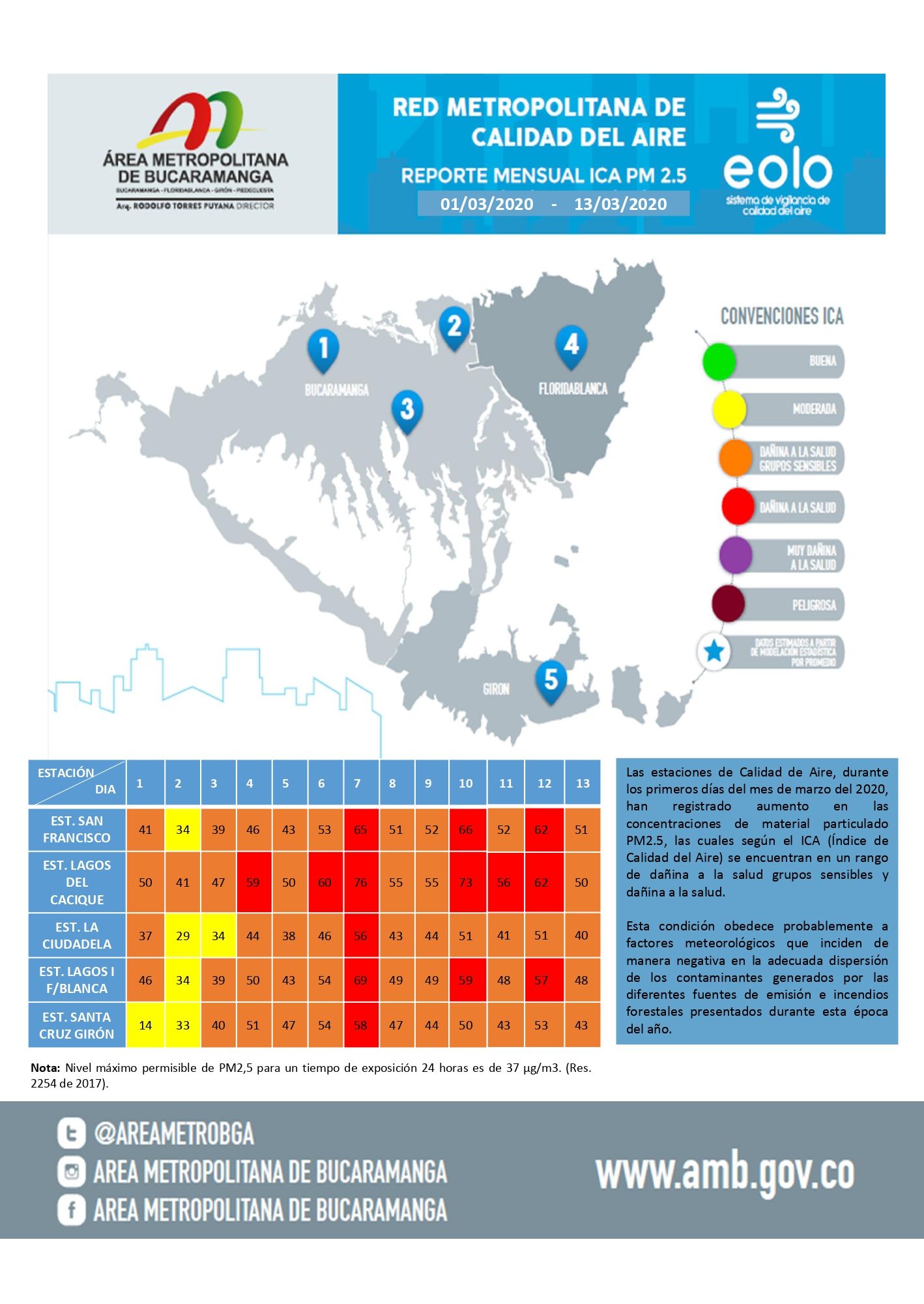 Con reporte al 13 de Marzo de 2020, las cinco estaciones del AMB para monitoreo de material particulado registraron concentraciones cuyo Índice de Calidad del Aire -ICA- representa un riesgo a la salud de grupos sensibles.