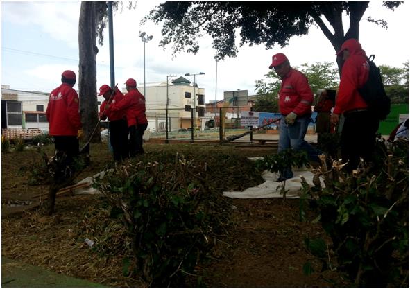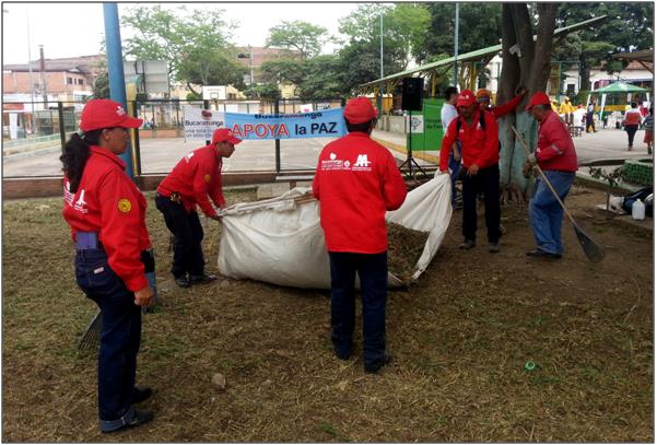 “Materiales al Parque” en el barrio Girardot inició a las 8 de la mañana con la llegada directora del AMB Consuelo Ordóñez, los Agentes de Cultura Ambiental, las cuadrillas de poda y limpieza, el personal de las cooperativas de reciclaje y los operarios de la Empresa de Aseo de Bucaramanga.