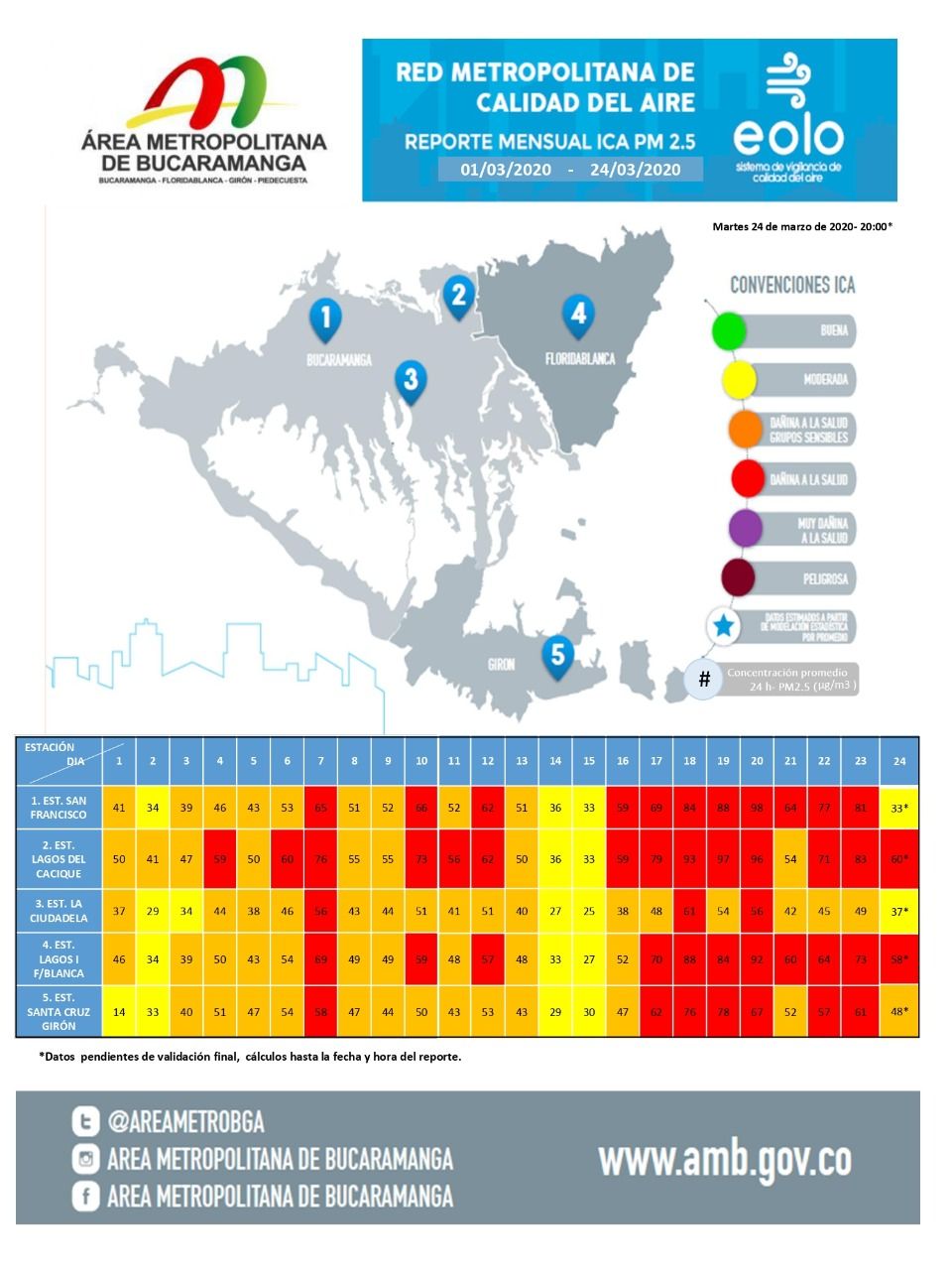 25 de marzo | Una tercera estación, la del barrio Santa Cruz de Girón, permanece en el rango Dañino a la Salud de Grupos Sensibles de la Población [color naranja].Las dos restantes localizadas en Lagos del Cacique de Bucaramanga y Lagos Uno [Floridablanca] continuaron en el rango Dañino a la Salud [color rojo].