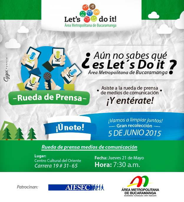 El Área Metropolitana, Jorge Luis Rico, líder de Let´s Do it y Consuelo Ordóñez de Rincón, Directora del Área Metropolitana de Bucaramanga, invitan cordialmente a un RUEDA DE PRENSA con el propósito de compartir detalles y responder todas las inquietudes sobre la gran brigada "VAMOS A LIMPIAR JUNTOS" los cuatro municipios del área metropolitana.